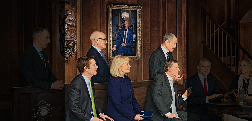 Bold and symbolic, the 2025 Chair’s portrait is a digitally-constructed photograph featuring Bruce alongside members of the Lloyd’s Council that supported his leadership. Shot in Lloyd’s Old Library, sitters are portrayed both in dialogue with each other and with objects from Lloyd’s historic Collection.